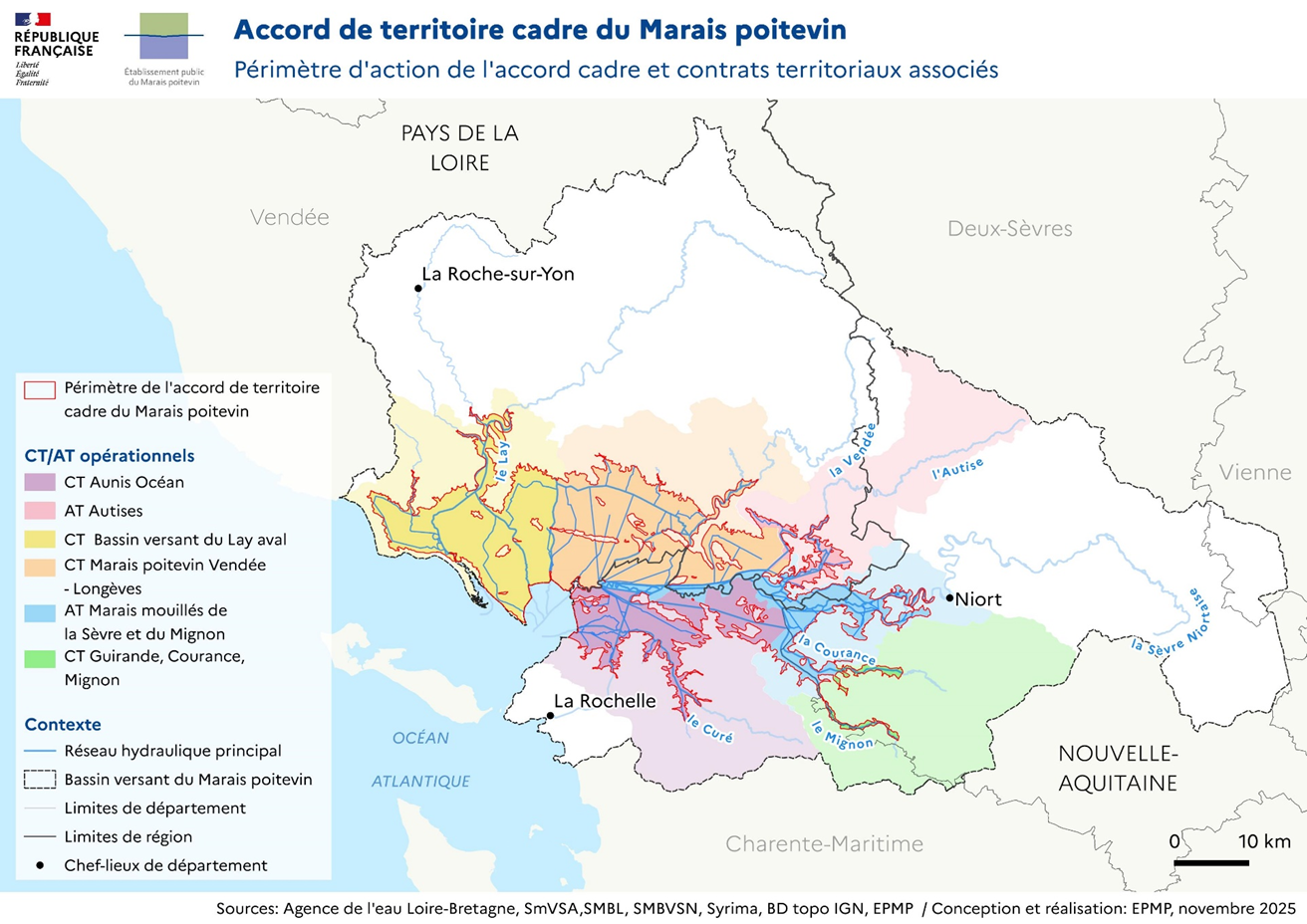 L’accord de territoire cadre du Marais poitevin couvre la période 2020-2025 et succède ainsi au premier contrat initié sur 2015-2019. Il est fondé sur les enseignements tirés de la première programmation, qui a bénéficié d’une évaluation en 2019 et 2025. Il comporte une stratégie territoriale et une feuille de route, coconstruites et validées avec les acteurs du territoire, qui fournissent une ligne de conduite pour les 6 ans à venir.